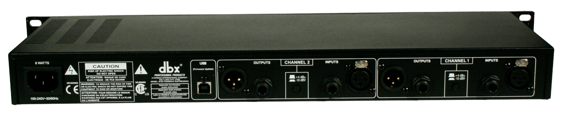 Der dbx AFS2 hat einen äußerst schnellen Algorithmus zur Erkennung von Rückkopplungen. Treten Rückkopplungen auf, greift der Algorithmus korrigierend ein. Extrem schmale Notch-Filter werden gesetzt (bis zu 1/80 einer Oktave) und so unerwünschte Feedback-Frequenzen entfernt. Da nur ein Bruchteil des Frequenzspektrums bearbeitet wird, ist eine Veränderung des Klangs kaum hörbar.
